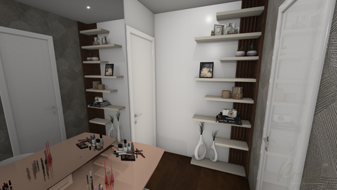 Bar: Neste projeto existe um recuo na parede próximo a cozinha que utilizamos para criar um Bar com um lindo espelho, portas de giro com puxadores Gold e nicho superior em Beton Matt e um Painel Ripado no restante da parede, também utilizando o Beton Matt junto ao Preto TX trazendo uma elegância ao ambiente.