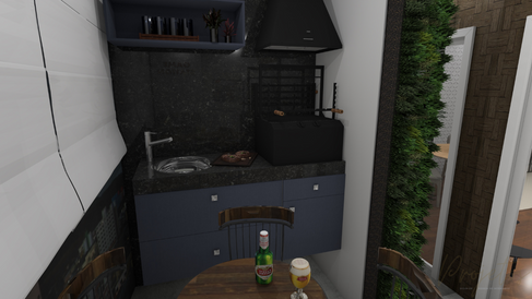 Varanda Gourmet: Com Bistrô que acrescenta na decoração e na funcionalidade do Espaço para Lazer com a família e amigos. Churrasqueira e pia na bancada de apoio, com armário inferior com portas de giro e gaveta com puxadores Zen todo em Lord e Caixas em Branco.